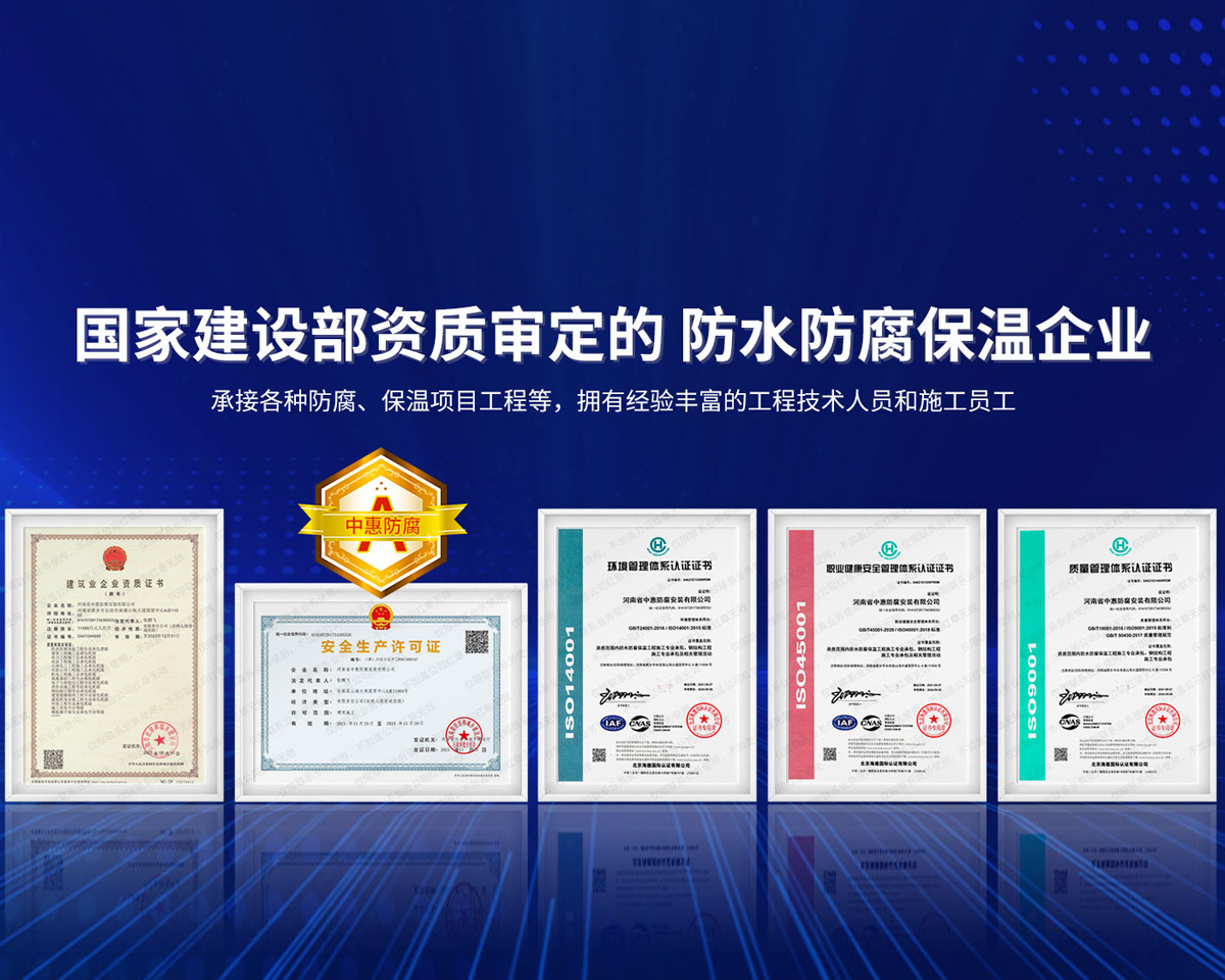 公司經營范圍:防水防腐保溫工程;消防設施工程;建筑裝修裝飾工程;建筑機電安裝工程;電力工程;建筑工程;石油化工工程;工業清洗工程;油罐清洗工程;鋼結構工程;環保工程;模板腳手架工程;電纜防火封堵、防污閃噴涂、外墻外保溫工程;各類施工勞務作業;設備維修、船舶鉚焊、涂裝;電力工程材料、建材、防水材料、防火材料、防腐保溫材料銷售,并相繼通過了GB/T19001-2008idtISO9001:2008GB/T50430-2007質量管理體系認證證書。GB/T24001-2004idtISO14001:2004環境管理體系認證證書。GB/T28001-2011idtOHSAS18001:2007職業健康安全管理體系認證證書。公司是中國防腐蝕于防護協會、中國施工企業管理協會、電力協會和中國鋼結構防水協會會員單位。 公司的經營業務涵蓋了石油、化工、電力、冶金、煤炭、船舶、國防、燃氣、水利、環保、交通運輸、航空及國防軍工和輕紡市政等行業的防腐保溫絕熱設備。鋼結構安裝、防火、防水、金屬噴鍍、聚脲噴繪、陰極保護、防滲透堵漏、玻璃鋼及各種磚版材料襯里、橡膠襯里、煙氣硫和耐酸溶劑腐蝕等工程施工。公司連續十年榮獲“省市先進施工企業”“安全生產先進單位”“重合同,守信用企業”和“AA***資質企業”的稱號。2000年被命名為市級文明單位,2002年被國家工商行政管理局命名為“重合同,守信用的企業”、被中國工業防腐蝕技術協會命名為“防腐蝕企業,能源節約及環境保護領域有豐富的經驗和***的業績。工程一次交驗合格率100%。其中攀枝花鋼鐵公司煉鐵廠四號高爐及熱風爐防腐工程、上海寶鋼公司煤氣柜防腐工程、撫順石油一廠裝置防腐項目、齊魯石化公司稀烴廠高塔防腐工程、吉林化學工業公司煉油廠油罐防腐工程、天津石化熱電廠六號爐頂棚聯絡管保溫工程、大慶油田(太倉)力神泵業工程、中國化學工程第十一建設工程、中原油田勘探局工程、中國石化銷售有限公司華北分部、魯皖輸油管道工程、貴州開磷息烽合成氨工程、陜西黃陵煤化工程、中國石油天然氣西部管道塔里木輸油工程、邯鋼集團邯寶鋼鐵公司煉鐵工程、德州供電工程、吉寶(南通)船廠工程,偃師華潤熱力工程、鄭州熱力總公司。 河南省中惠防腐安裝有限公司愿以豐富的施工經驗,***的技術,***的設備,***的管理,***的服務,竭誠為國內外廣大的用戶提供***滿意、******的工程作品。 我公司愿與國內外同仁一道,團結協作,共同推進防腐蝕行業發展! 公司地址:河南省長垣縣建設路北段360號 固定電話:0373-8866488 郵編:453400 網址:http://www_zhff_com_cn.worldctrip.com
